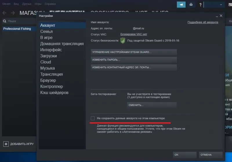 В верхнем меню нажмите на «Steam», перейдите к «Настройкам», следом – к «Аккаунту». Тут нужно снять флажок с опции сохранения данных на PC.