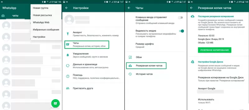 - Перейдите в меню «Чаты / Резервная копия чатов»