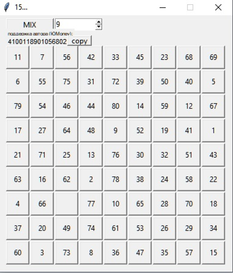 15 — головоломка, которая представляет собой набор из одинаковых квадратных костяшек с нанесёнными на них числами. Цель игры — упорядочить костяшки по возрастанию номеров, перемещая их внутри коробки, желательно сделав как можно меньше перемещений.