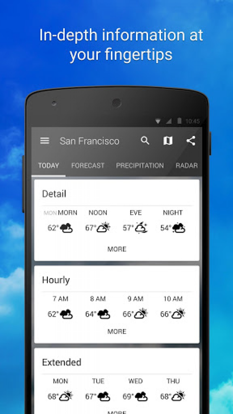1Weather Программа, с помощью которой вы сможете узнать точную погоду почти во всех городах мира в реальном времени, а так же ознакомиться с прогнозом на 7 дней вперед. Узнайте о температуре воздуха, скорости и направлении ветра, наличии осадков, качестве воздуха и многом другом, просто взглянув на свое мобильное устройство.