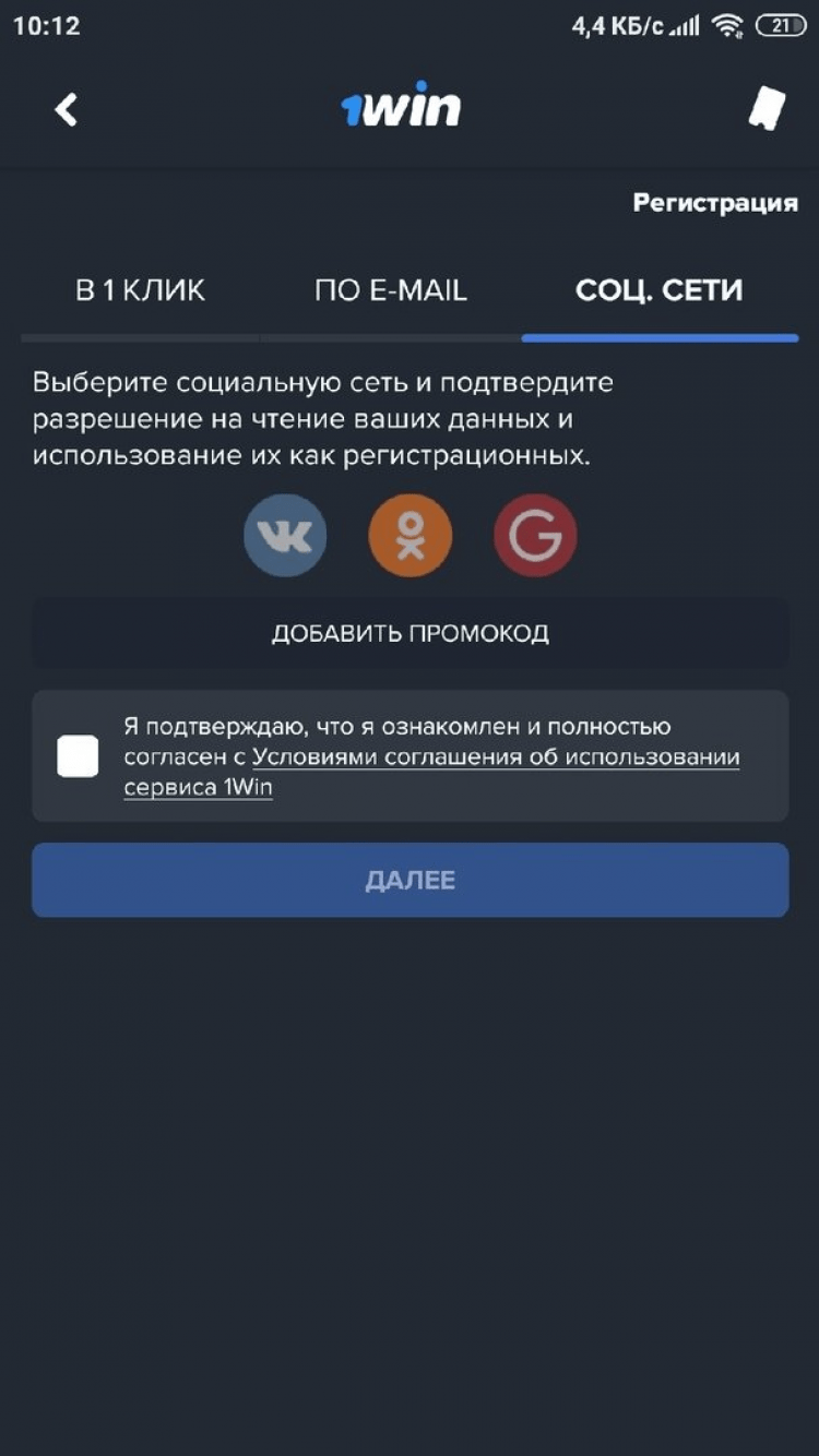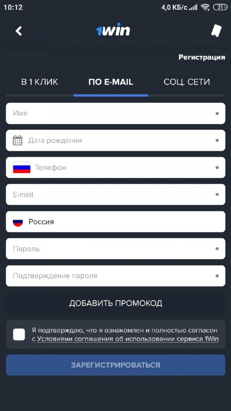 Регистрация в приложении 1win