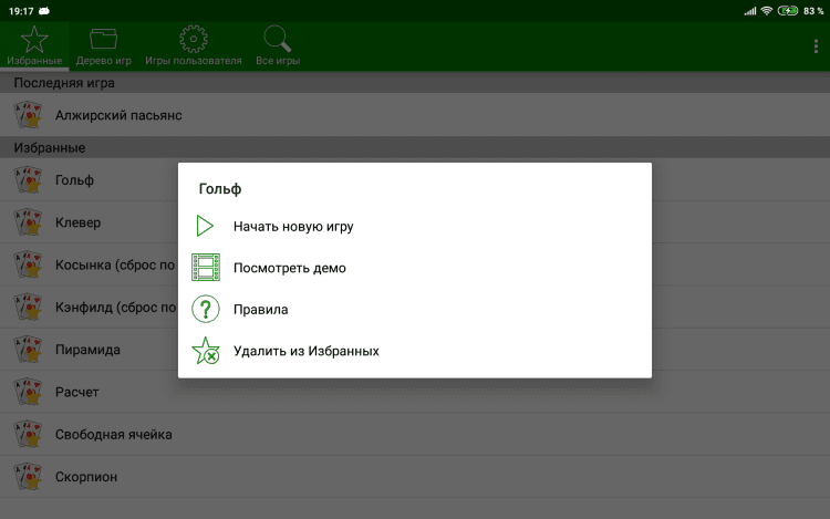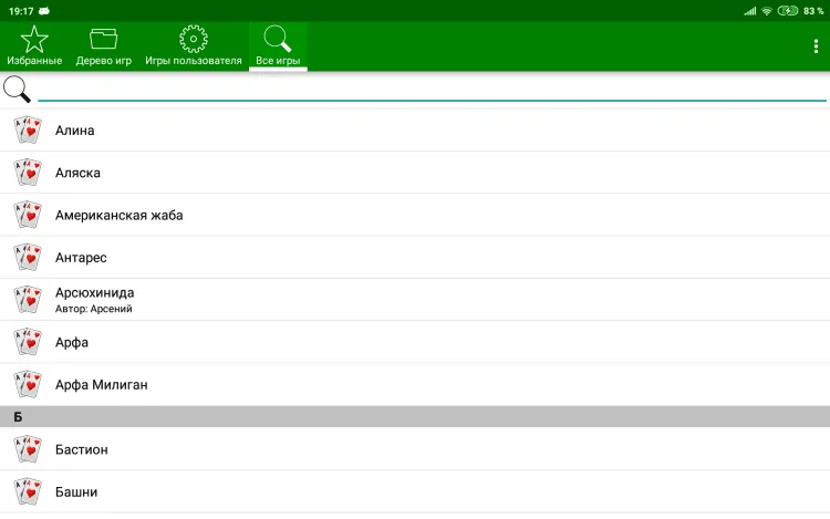 В этой программе вы найдете коллекцию из 253 пасьянсов. Все они разбиты на удобные категории на русском языке, что поможет быстрее найти интересующую игру. Для каждой игру вы сможете прочесть понятные правила и просмотреть демонстрацию, чтобы лучше понять игровой процесс. Однако самой приятной функцией программы является возможность создания собственных пасьянсов.