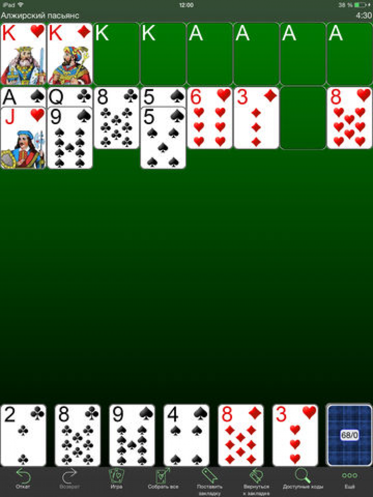 250+ Solitaires "250+ Solitaires Free" это коллекция из 253 пасьянсов. Коллекция включает такие игры как Свободная ячейка, Косынка, Клондайк, а также множество других оригинальных пасьянсов. Для каждого пасьянса имеется описание и демонстрация.