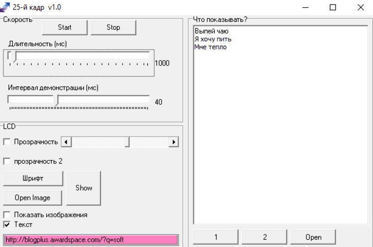 25KADR - это программа создает эффект 25-го кадра. С помощью воздействия 25-го кадра на подсознание можно учить ,например, английский язык! Вам предоставляется эта возможность. С помощью этой программы можно проверить на себе воздействие 25-го кадра при просмотре видео или обычной работы за компьютером.