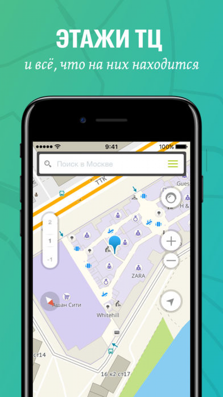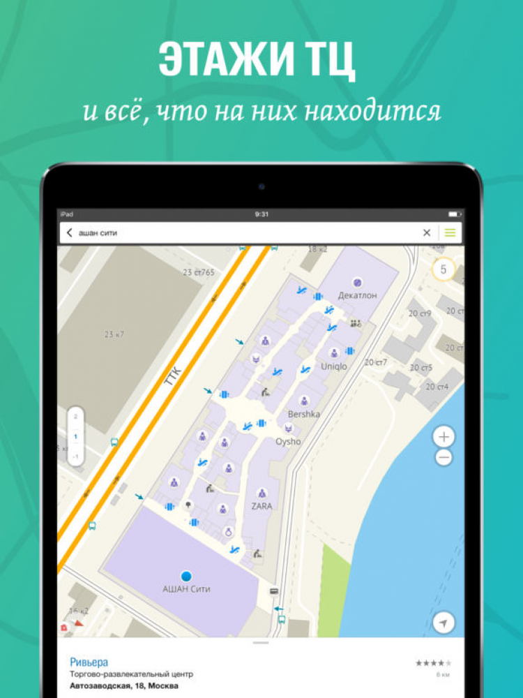 Приятной особенностью программы 2ГИС является наличие подробных карт по этажам для крупных торговых центров. Узнавайте расположение бутиков и различных отделов, находящихся на территории торгового центра, а так же быстро находите закусочные и туалеты.