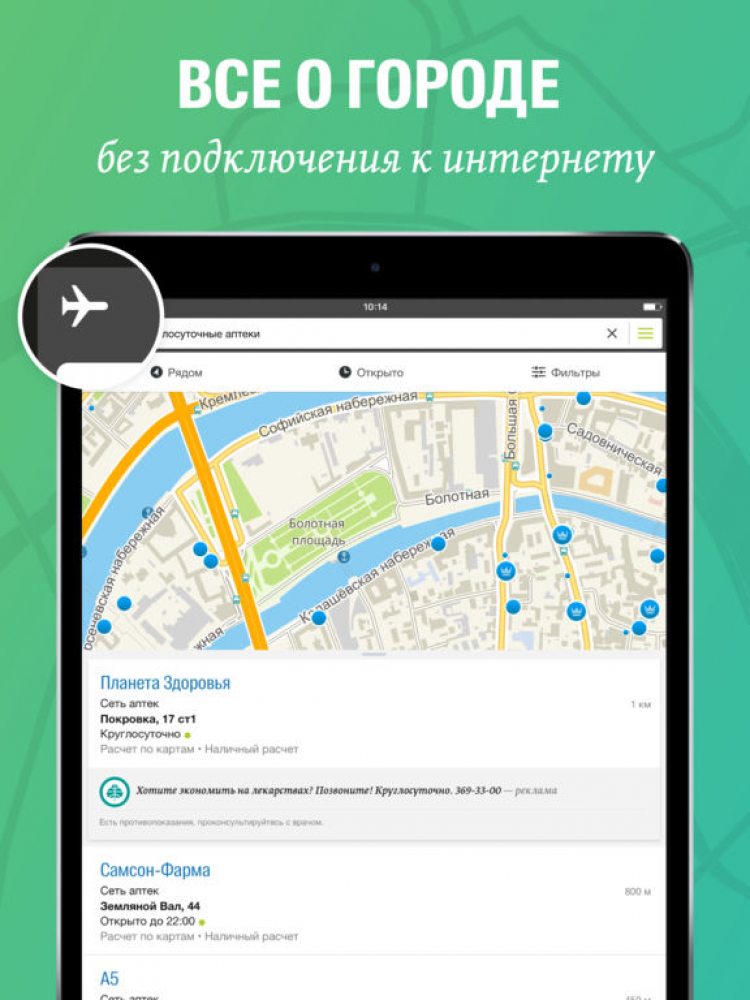 Находите нужные вам адреса или объекты на полностью трехмерной карте своего или незнакомого вам города в любой момент, при помощи этой программы. Она также позволяет узнавать адреса и телефоны фирм, графики их работы, даже без доступа в Интернет.