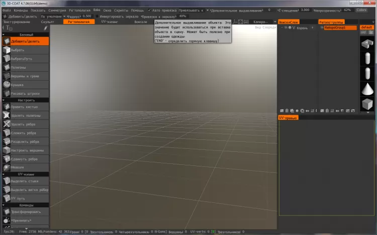 3D Coat предоставляет в распоряжение пользователя большую коллекцию визуальных эффектов и текстур, которые можно использовать в работе. Благодаря использованию ретопологии, воксельного скульптинга и UV-маппинга, становится возможным создание высоко детализированных трехмерных моделей любой сложности.
