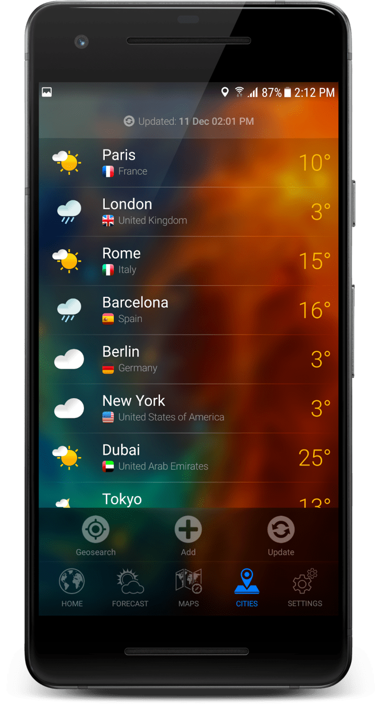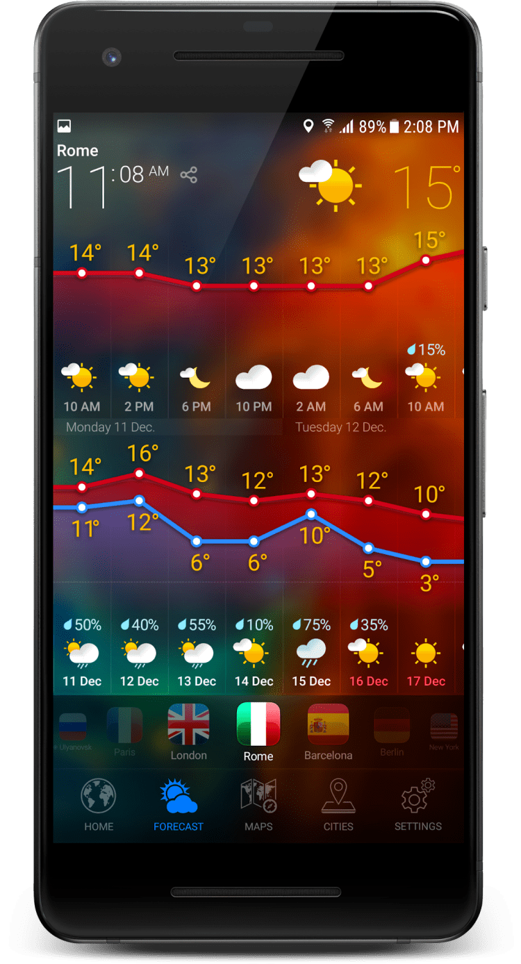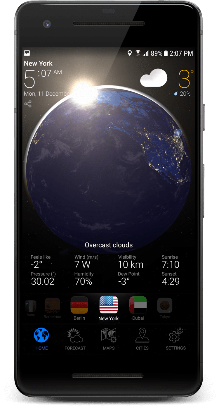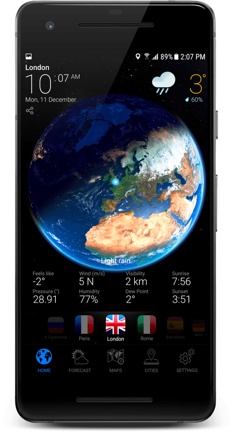 Перед вами приложение для мобильных телефонов и планшетов под управлением Android, которое объединяет в себе сразу несколько возможностей. Во-первых, это предоставление точного прогноза погоды. Последняя версия программы имеет доступ к погодным станциям по всему миру и позволяет предоставлять точные прогнозы для практически любого места в мире. Помимо этого, программа позволяет использовать удобные часы, виджеты и содержит красивые виды Земли из космоса.
