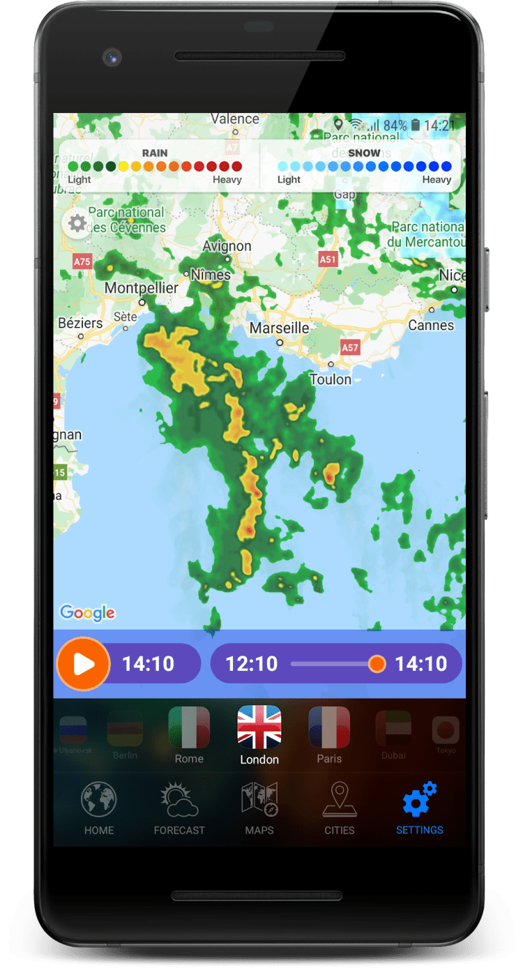 - радар дождя, предоставленный Rain Viewer;