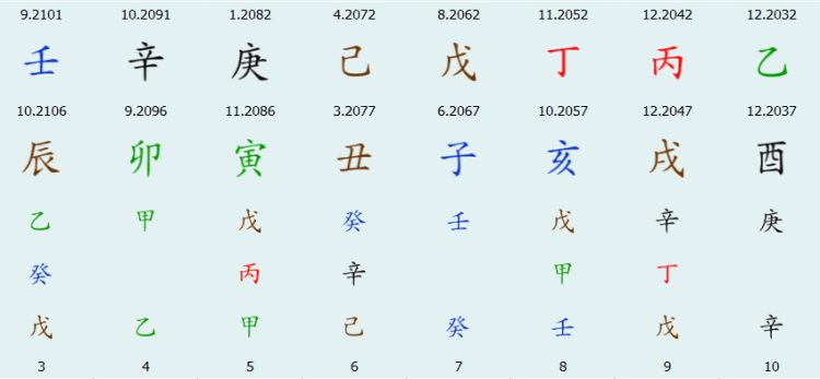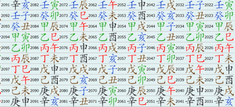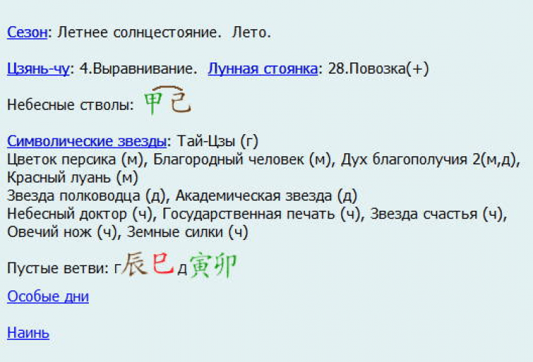 Рассчитаны сезоны китайского календаря, цзянь-чу (12 дневных чиновников), лунная стоянка, пустые ветви, система на-инь. Указаны безденежные дни, китайский лунный новый год.