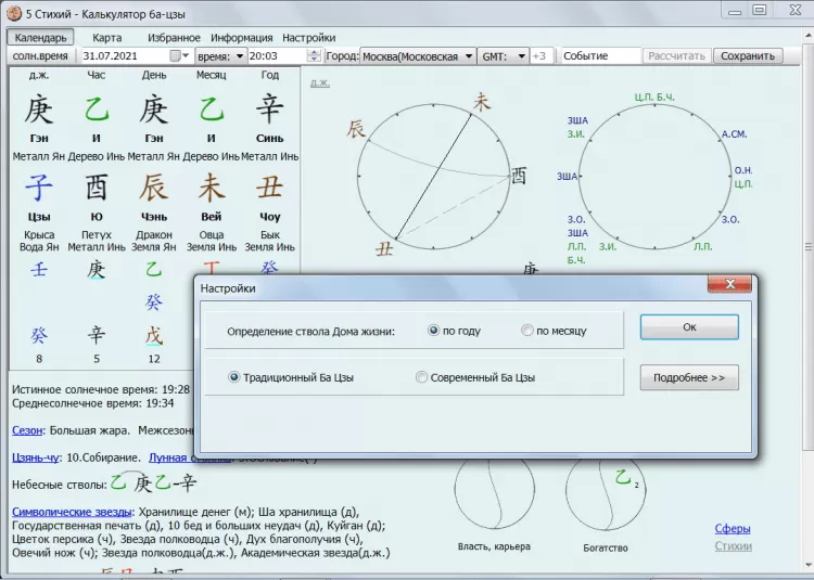 5 стихий – программа калькулятор ба цзы. Рассчитывает небесные стволы, земные ветви, фазу Ци, скрытые стволы, символические звезды, взаимодействия (комбинации) стволов и ветвей на выбранную дату.