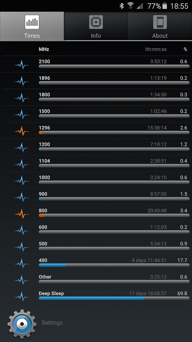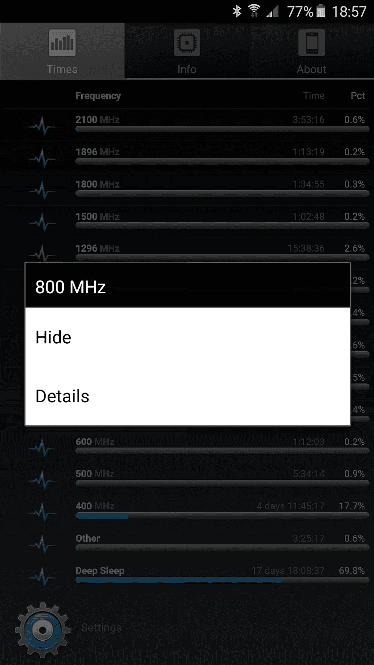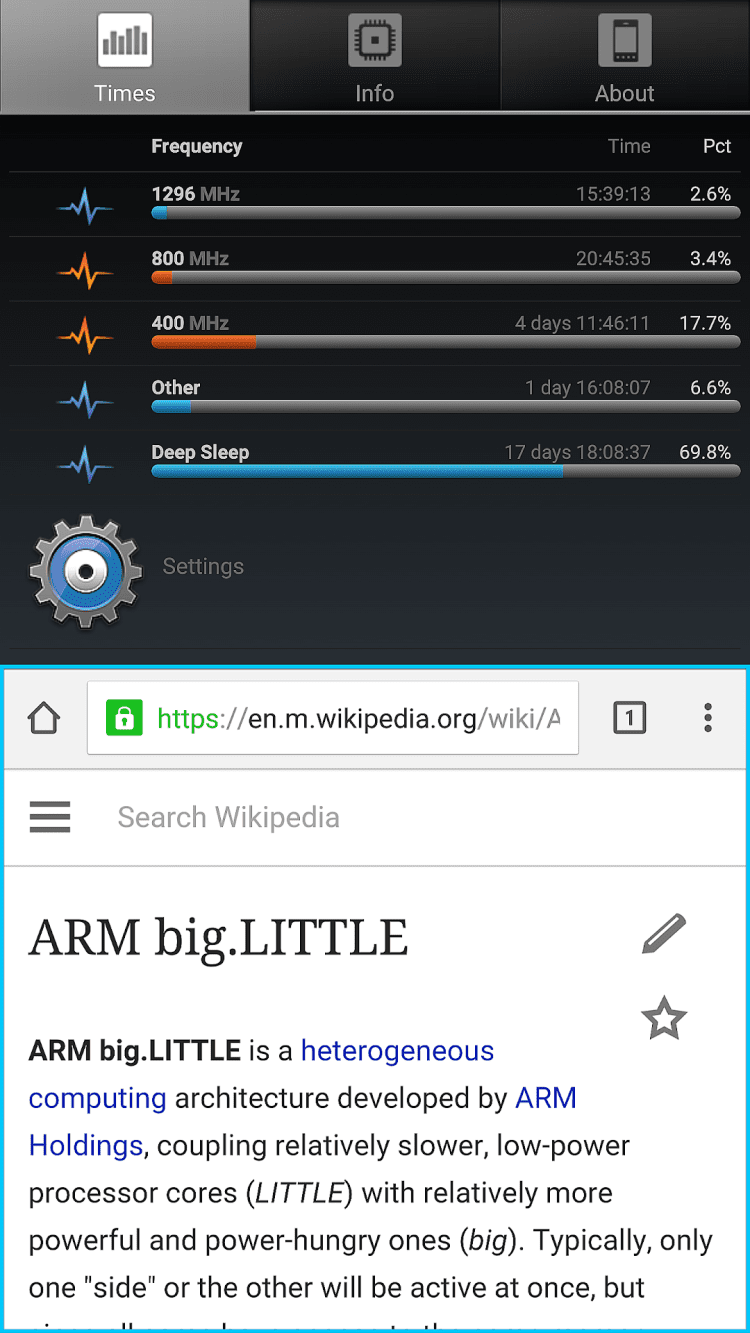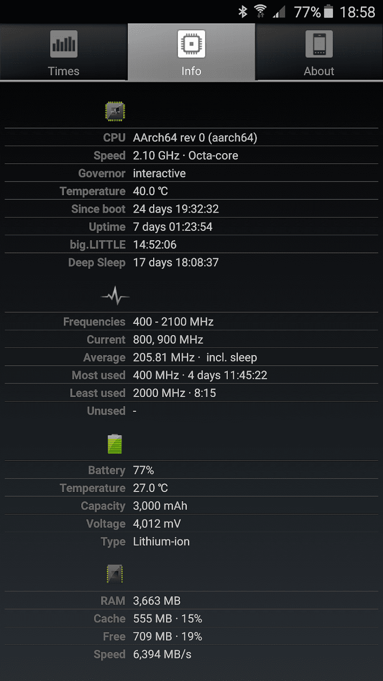 A1 CPU Tool Эта программа отображает время, необходимое процессору вашего устройства для выполнения тех или иных операций, а так же его частоту. Вы так же сможете просматривать загрузку процессора в реальном времени, его температуру, минимальные и максимальные частоты, а так же модель и производителя процессора. Помимо этого, программа A1 CPU Tool позволяет просматривать тип батареи, ее вольтаж, температуры и уровень заряда, а так же информацию об оперативной памяти устройства.