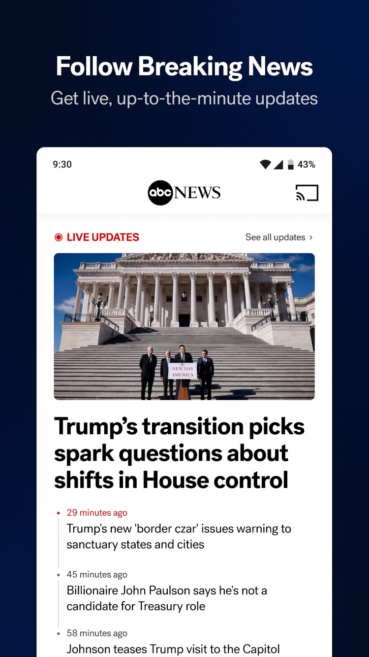 ABC News — ваш надежный источник самых последних новостей в США и во всем мире. Он предоставляет вам актуальные статьи и своевременные оповещения о новостях, основанные на ваших интересах.