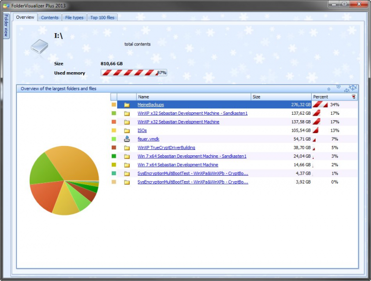 Abelssoft FolderVisualizer поможет узнать, какие файлы или папки на вашем жестком диске занимают больше всего места. Она в наглядном виде предоставляет информацию о размере файлов и папок. И так же может составить список топ-100 самых "тяжелых" файлов на диске.