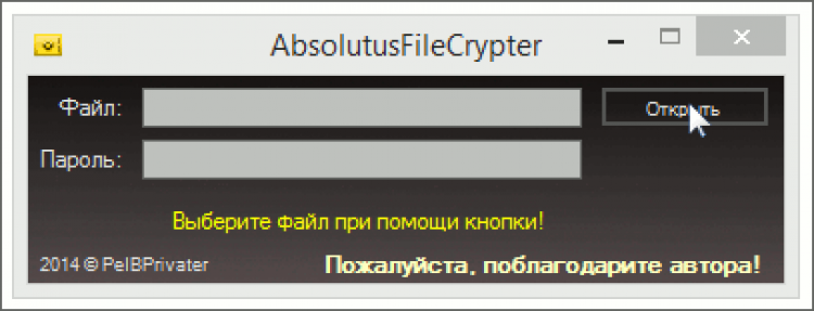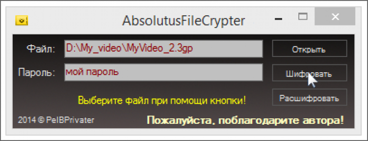На помощь придет портативная программа «AbsolutusFileCrypter», при помощи которой можно легко зашифровать любой файл используя пароль. И можете больше не волноваться о том, что ваша личная информация станет доступна постороннему лицу. Алгоритм используемый в данной программе фактически является абсолютно надежным и не подверженным взлому, о чем свидетельствует специальное исследование и мнение независимого эксперта в области информационной безопасности (см. в справке к программе).
