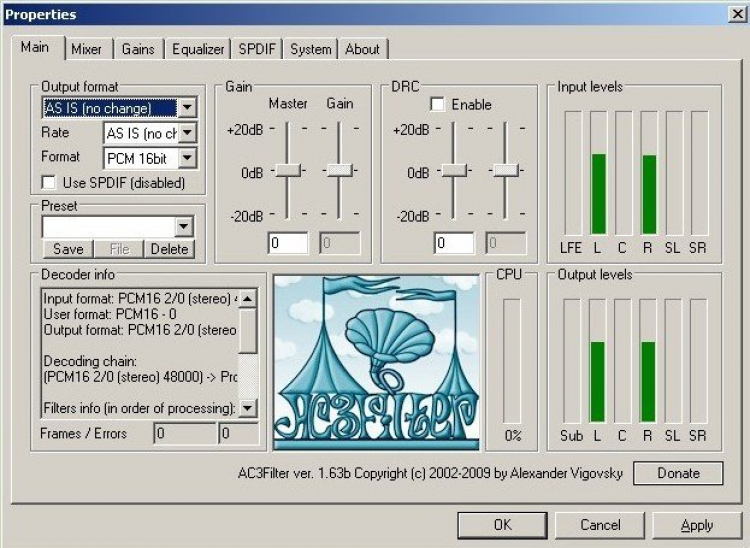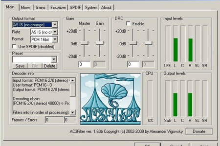 AC3filter - это свободный DirectShow-фильтр, предназначенный для декодирования и обработки звука в реальном времени. Фильтр декодирует форматы аудио AC3/DTS, поддерживает многоканальный и/или цифровой (S/PDIF) выходы. Имеется возможность воспроизведения файлов AVI и MPEG-2 (DVD) с аудиодорожками в формате AC3.