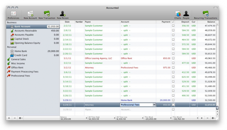 Accounted - программа для ведения бухгалтерии, обладающая рядом полезных функций. Она позволяет выполнять двойные бухгалтерские записи, вести учет дебиторской/кредиторской задолженности, разделять транзакции, печатать чеки и многое другое. При этом программа обладает удобным, интуитивно понятным интерфейсом и проста в использовании.