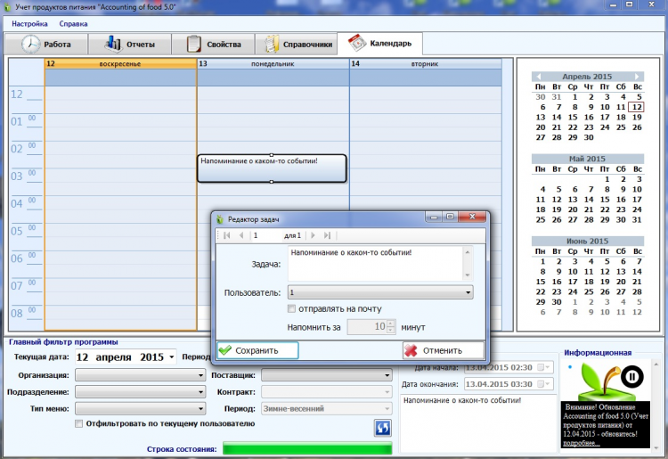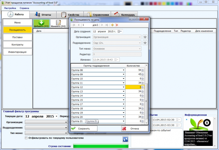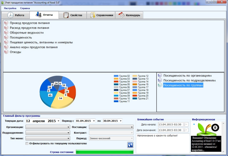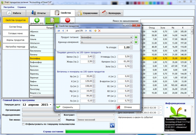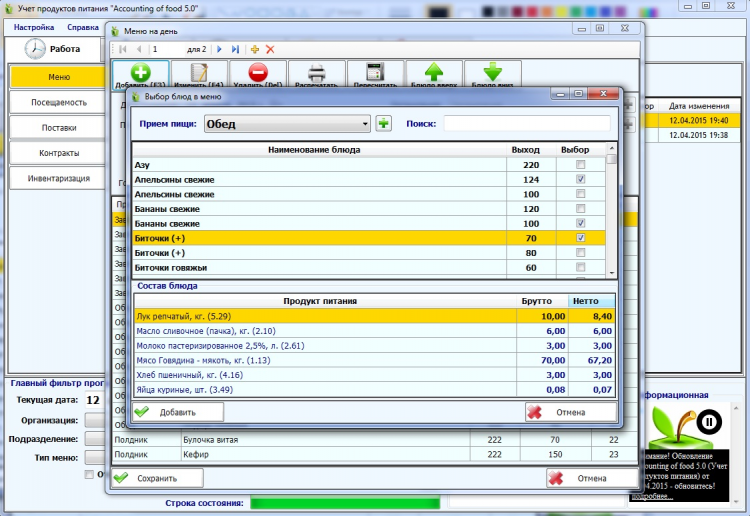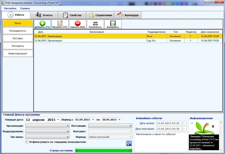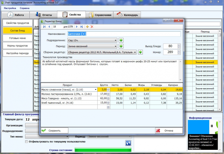 Программа станет для вас хорошим инструментом облегчая трудоемкую работу по составлению и расчету меню. Возможности программы позволяют автоматизировать весь процесс учета питания от поставки продуктов до контроля рациона и стоимости питания. Лучшая программа для учета продуктов питания среди существующих аналогов.
