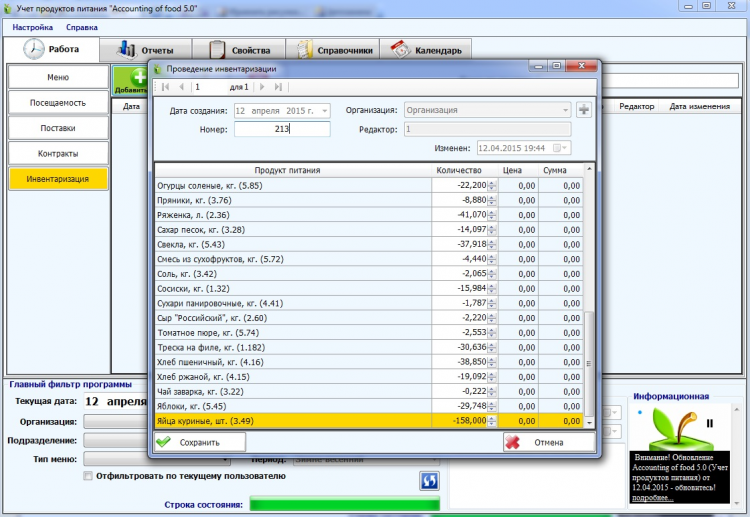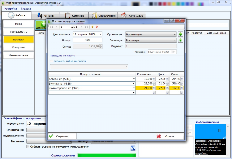 Accounting of food (Учет продуктов питания) - это программа, которая поможет правильно и быстро рассчитать и заказать необходимое количество продуктов, оформить в соответствии с требованиями приказов и методических рекомендаций все первичные и отчетные документы.