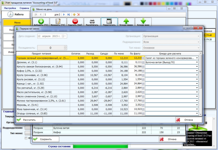 - Перерасчет меню по остаткам на складе.