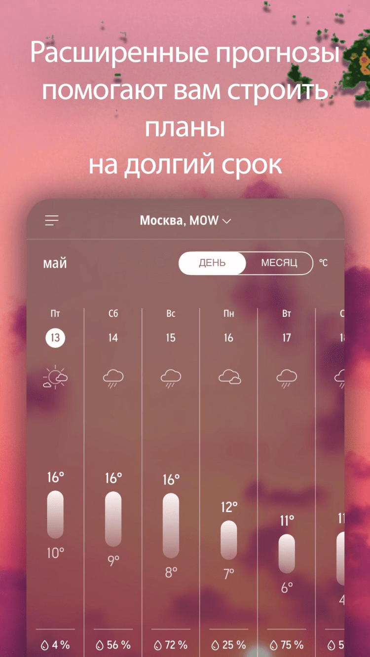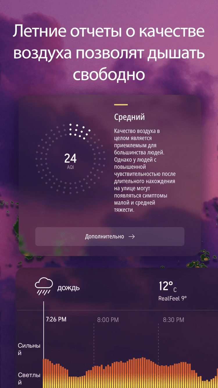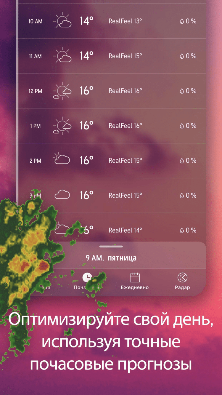 Приложение позволит вам узнать температуру и влажность воздуха, уровень видимости, солнечной радиации, скорость и направление ветра, а также время рассвета и заката. Благодаря уникальной системе прогнозирования погоды Real Feel, вы сможете узнавать, как ощущается местная температура воздуха на самом деле. При этом, информация о погоде в приложении постоянно обновляется.