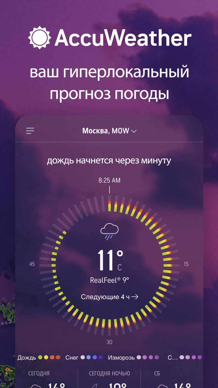 AccuWeather Узнавайте заранее информацию об изменении погодных условий в вашем городе или любой точке мира, просматривая подробные и точные персонализированные прогнозы прямо на экране своего мобильного устройства.