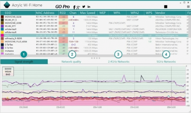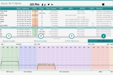 Приложение поддерживает сети 802.11/a/b/g/n/ac и снабжает информацией о MAC-адресе, канале, WEP, WAP или WAP2 каждой из них, а также показывает уровень сигнала. Acrylic Wi-Fi Free позволяет отслеживать входящие и исходящие данные, отображая их структуру, точный размер и адрес назначения. Программа также работает с GPS данными, позволяет определить географические координаты вашего положения. Все точки доступа, которые были проанализированы попадают в инвентарь, где их можно найти, просмотреть информацию и управлять ими. Так же программа поддерживает скрипты