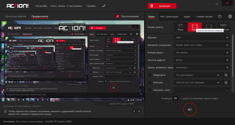 Рассмотренные выше достоинства дополняются интуитивным и логичным интерфейсом, который дает право использовать рассмотренные возможности Action! для Windows, быстро находя нужные функции.