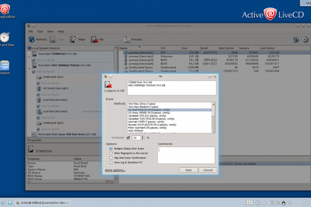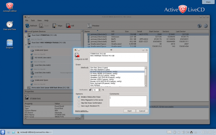 Active@ KillDisk Linux Suite Active@ KillDisk эта программа поможет полностью очистить жесткий диск, удалив с него все файлы и стерев любые оставшиеся следы, исключив тем самым возможность восстановления удаленных файлов. Программа поддерживает 20 методов удаления на выбор, и может стирать данные с нескольких дисков одновременно.