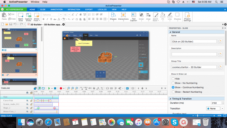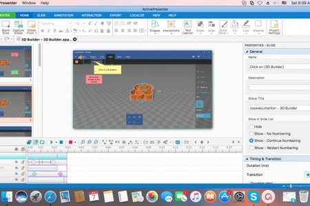 Порядок действий в ActivePresenter простой: сперва вы записывает видео и звук, после чего все записи попадают во встроенный редактор, где можно отредактировать их, вставить дополнительные слайды, пояснения, интерактивные элементы и пр. Все инструменты редактирования доступны через основную панель инструментов. Они поделены на тематические владки. А когда видео готово, его можно экспортировать в MP4, FLV, AVI, WMV, WebM или MKV формат.