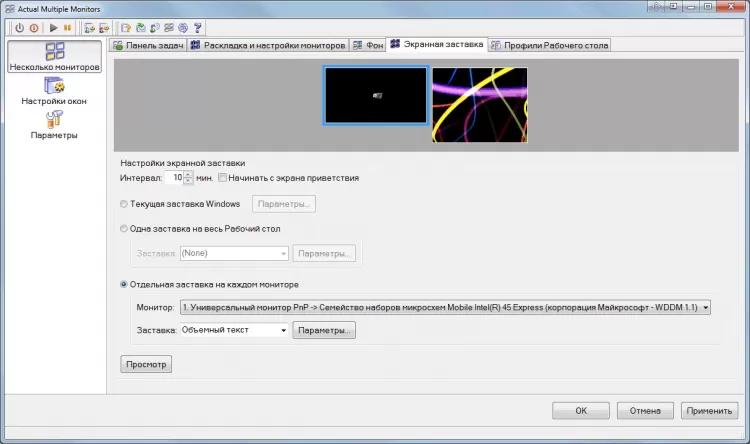 Все настройки в Actual Multiple Monitors, которые вы изменяете, включая разрешение, расположение окон и панелей, фоны, скринсейверы и пр, можно сохранить как профиль. Создайте несколько профилей для разных задач и переключайтесь между ними. Тогда вам больше не придется каждый раз настраивать все заново вручную.