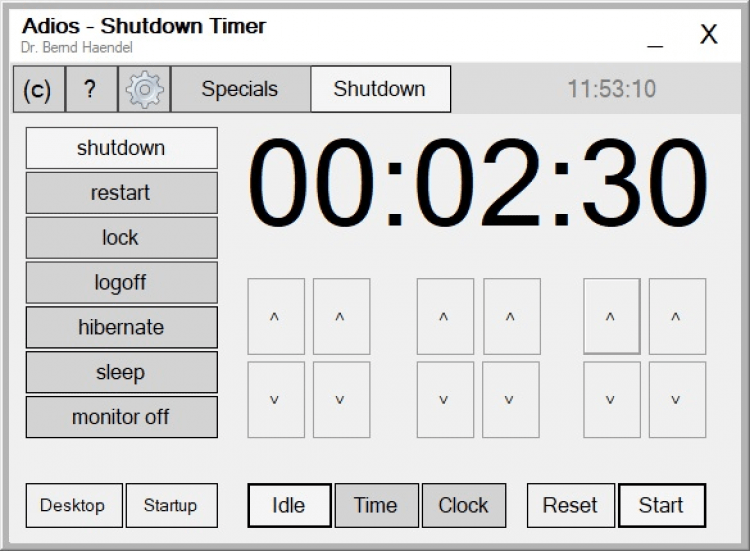 Доступно три режима: idle, time и clock. Каждый поставленный таймер запускается как отдельный процесс. Интерфейс приложения компактный и интуитивно понятный. Все кнопки подписаны, поэтому разобраться в программе не составит труда даже мало опытным пользователям. Из приятных опций можно отметить опцию выключения компьютера только после завершения всех закачек, если таковые имеются.