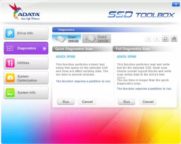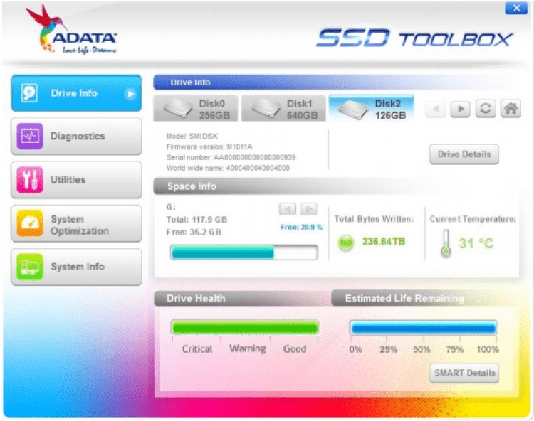 ADATA SSD ToolBox - это бесплатный набор инструментов для сбора информации и настройки параметров работы SSD-дисков. Это официальная программа, разработанная инженерами ADATA. Поддерживает огромное количество моделей дисков.