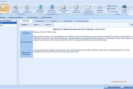 Программа берет на себя весь комплекс работ: Создание и хранение всей информации об объявлении (текст, контакты, рубрики досок, отчеты о предыдущих размещениях) Выбор досок и рубрик для размещения объявлений Автоматическая рассылка объявлений по всей базе досок, включая регистрацию на доске с почтовым подтверждением, обход защиты Captcha Создание отчета о рассылке Бесплатная интернет-визитка на поддоменах компании PromoSoft для простого размещения информации о Ваших предложениях.