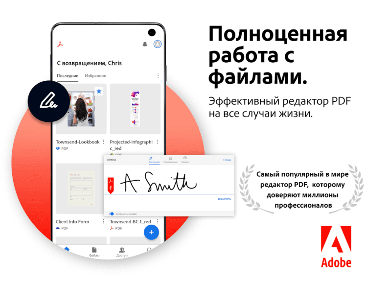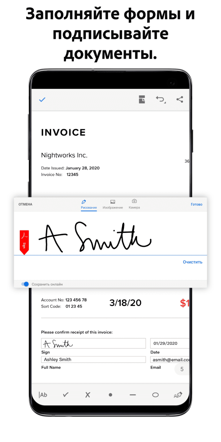 Приятной особенностью программы Adobe Acrobat Reader являются функции быстрого заполнения форм и создания электронной подписи на документах, при помощи пальца.