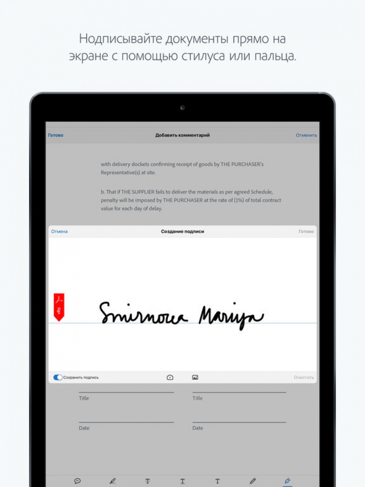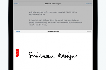 Приятной особенностью программы Adobe Acrobat Reader являются функции быстрого заполнения форм и создания электронной подписи на документах, при помощи пальца.