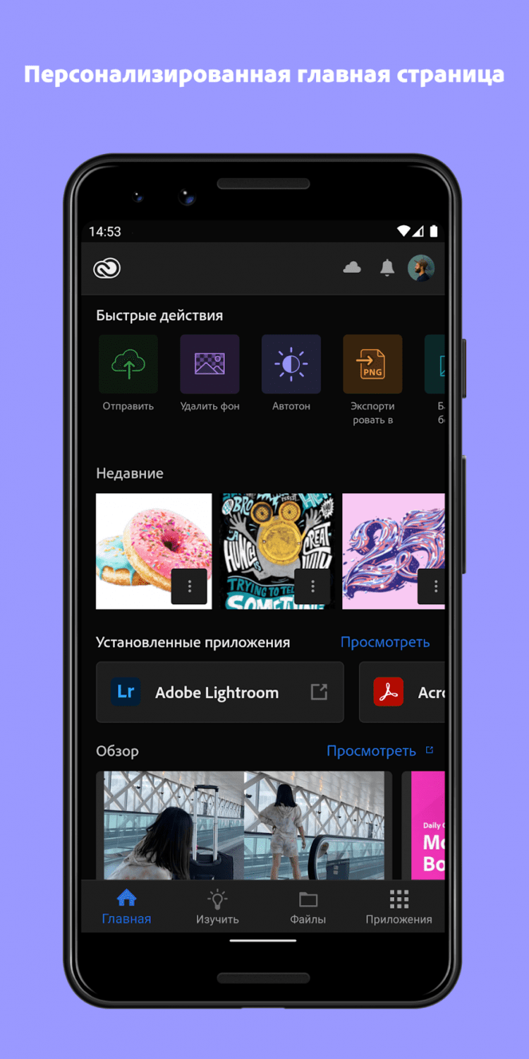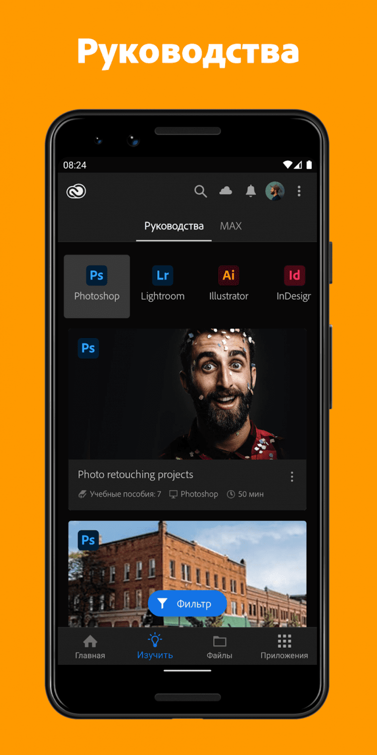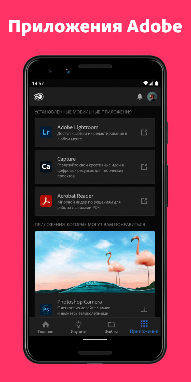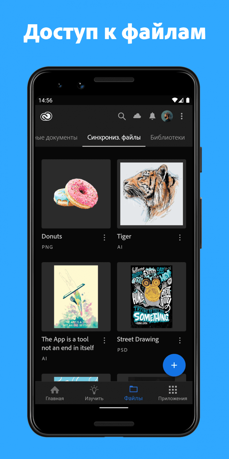 Adobe Creative Cloud — это приложение позволит вам получить доступ к облачному хранилищу Adobe Creative Cloud с вашего Android-устройства, просматривать файлы PSD, AI и прочие проектные файлы прямо с облака. При помощи этого приложения, вы сможете хранить свои проекты в безопасном месте и эффективнее взаимодействовать с коллегами. Для работы с приложением, вам необходим доступ в интернет и бесплатное членство в Adobe Creative Cloud. Бесплатное членство Creative Cloud включает в себя 2 Гб облачного хранилища и пробный доступ к каждому творческому инструменту от Adobe.