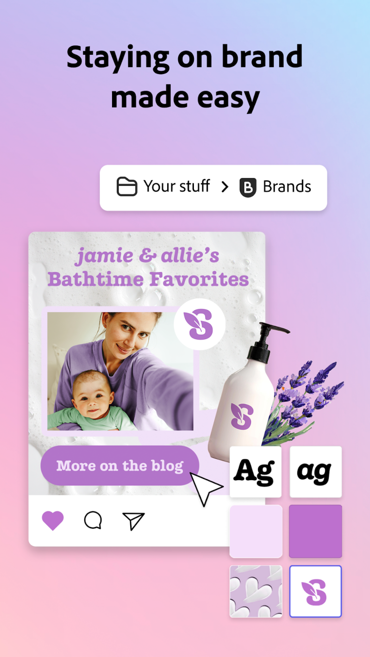 Это приложение станет вашим надежным творческим помощником для легкого создания потрясающей графики, видео и увлекательных постов в социальных сетях на ходу, благодаря мощному генератору изображений. Хватит тратить время на рисование графики с нуля. Положитесь на продвинутый ИИ и позвольте ему сделать свое дело. Если результат не совсем оправдывает ожидания, инструмент «Generative Fill», который может удалять, заменять или вставлять объекты на фото с помощью простых текстовых команд, может помочь достичь нужного вам эффекта. Чтобы упростить задачу, вы можете использовать многочисленные встроенные шаблоны или создавать свои собственные, чтобы генерировать контент в желаемом стиле. Еще одним преимуществом последней версии Adobe Express является создание бренд-китов. Они помогают создавать фирменный контент гораздо быстрее, имея под рукой все необходимые шрифты, логотипы или даже цвета.
