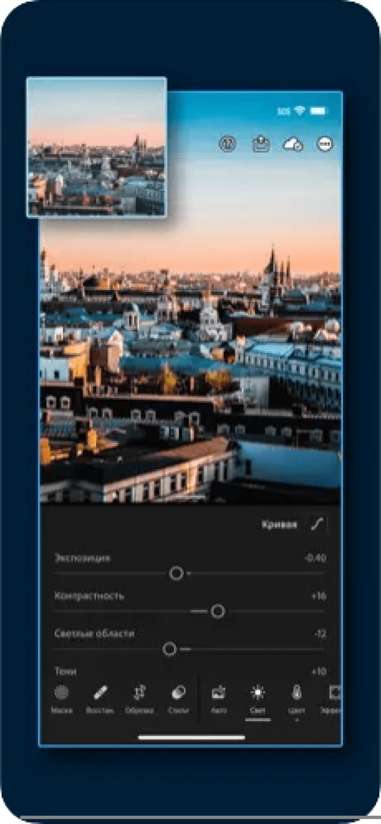С помощью этой программы вы сможете редактировать свои фотографии и RAW-изображения прямо на своем iPhone, а затем передавать их на компьютер. Adobe Lightroom содержит ряд мощных инструментов для редактирования изображений, знакомых всем с версии программы для ПК. Вы можете редактировать как снимки из памяти вашего устройства, так и новые, сразу же после съемки. Помимо этого, Adobe Lightroom позволяет синхронизировать метаданные и прочую информацию об изображениях с другими устройствами, на которых установлена мобильная или настольная версия Adobe Lightroom. Так же, вы можете делиться отредактированными снимками с друзьями через популярные социальные сети.