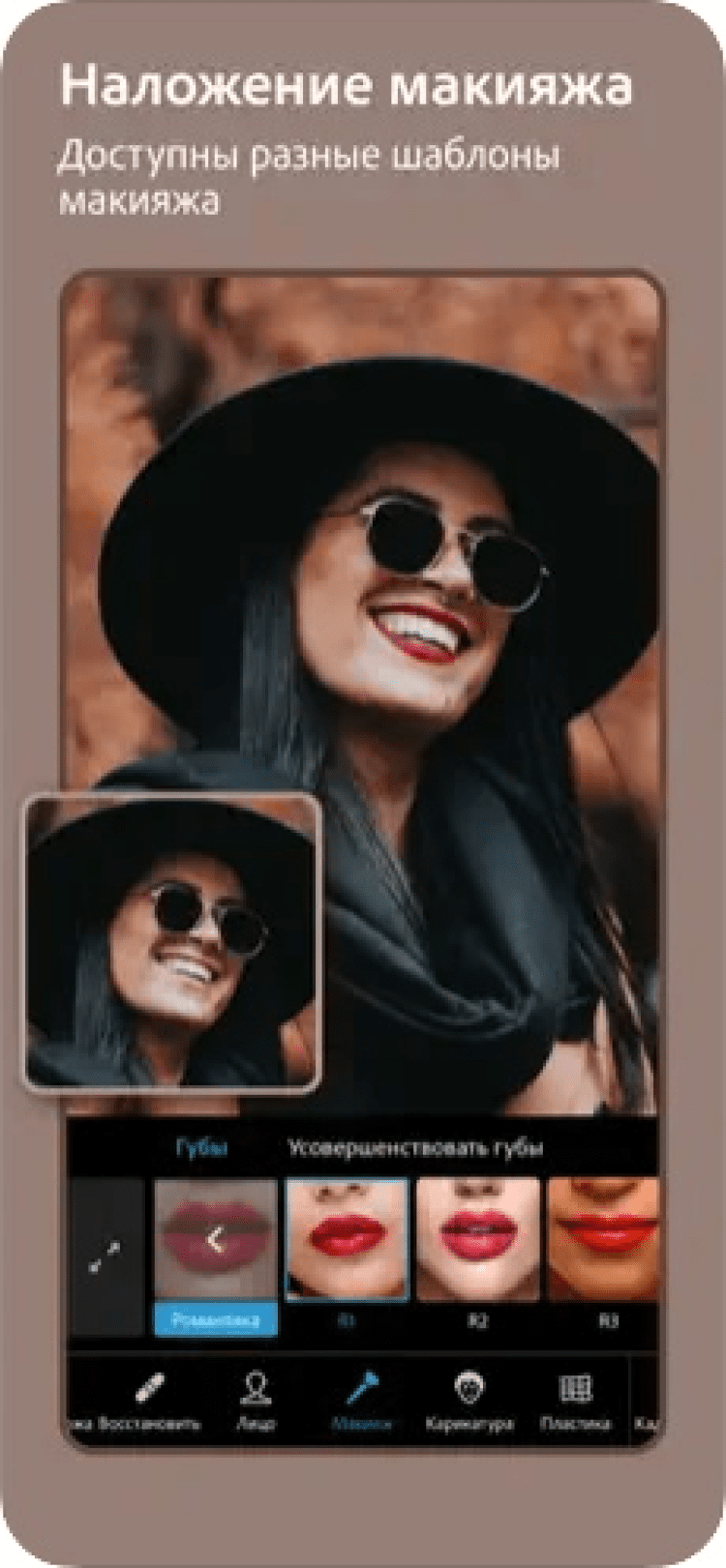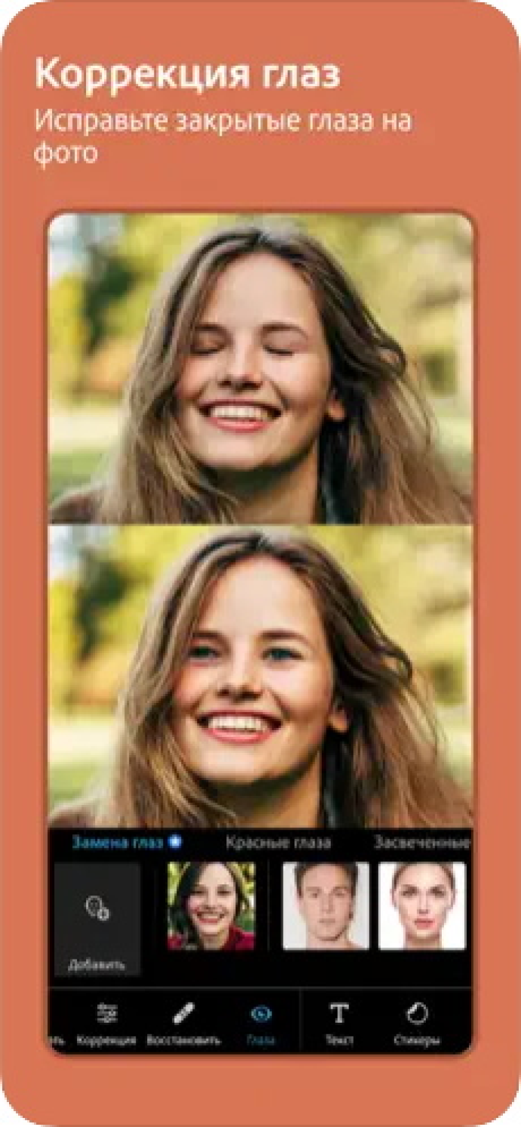 - Предлагает варианты ретуширования глаз.