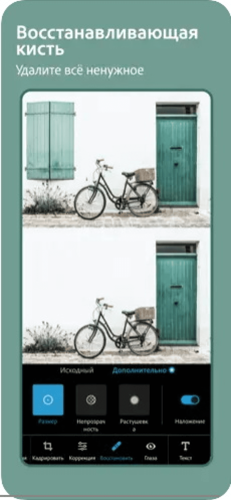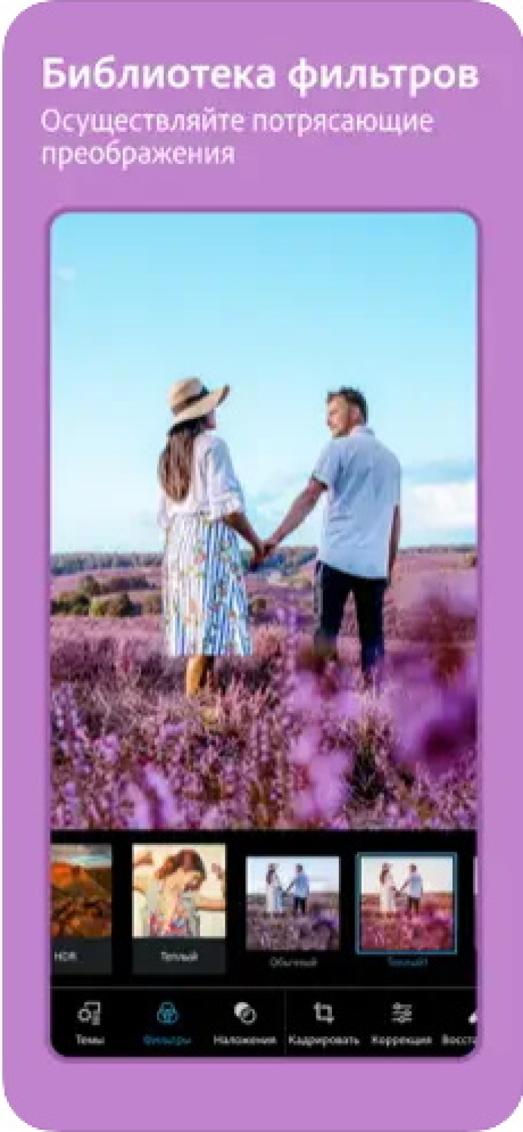 - интеграция с фотокамерой устройства, позволяющая обрабатывать кадр сразу после съемки;