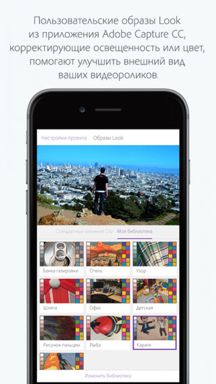 Помимо этого, Adobe Premiere Clip позволяет добиться отличного качества изображения, благодаря поддержке пользовательских образов Look. Они позволяют не только корректировать освещенность и цвет видео, но и улучшить их общее восприятие.