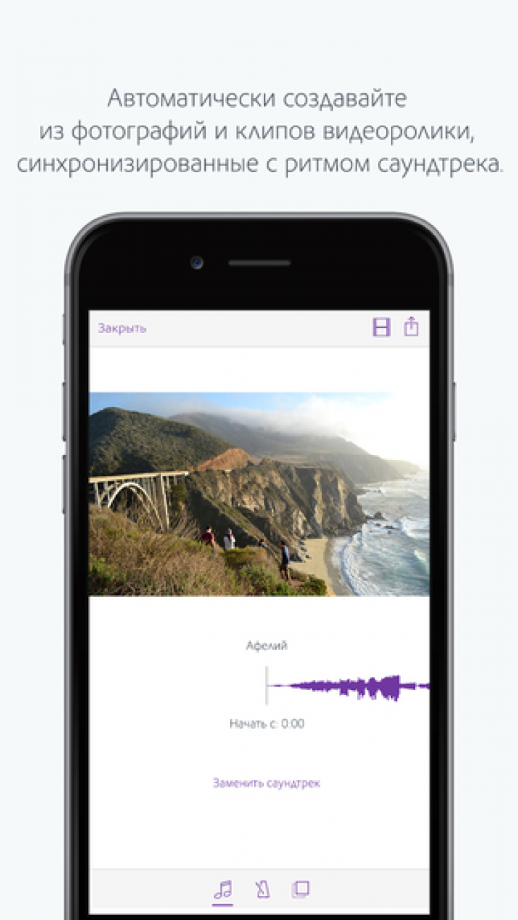 Вы сможете использовать большое количество встроенных в приложение саундтреков или добавлять собственные. В дополнение к этому, вы сможете быстро сгладить перепады уровней громкости между разными клипами и скорректировать громкость саундтреков в соответствии с общей громкостью видео благодаря функции "умной громкости".