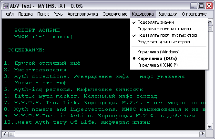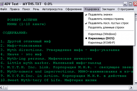ADV Text Reader Программа, позволяющая просматривать файлы TXT, DIZ, NFO и др. Поддерживает кодировки Windows, DOS, КОИ8-Р. Может сохранять открытые файлы или выделенные участки текста в любой из этих кодировок по выбору пользователя, также может сохранять текст в HTML с учетом настроек шрифта, и сохранять тексты в PDF (в т.ч. и русскоязычные). Размер открываемых файлов ограничен только размером виртуальной памяти. Поддержка различных схем оформления, механизма закладок и т.д. Фильтры "левых" символов и автопрокрутка текста. Встроены утилиты: сравниватель файлов реестров, транслитератор, анализатор содержания текста - определяет коэффициенты соответствия текста направлениям: научная фантастика, фэнтази, экшэн и т.д. Формирователь оглавления - выделяет из текста оглавление, позволяет переходить к выделеным разделам и осуществлять предварительный просмотр, и т.д. Программа также позволяет озвучивать текст с помощью синтеза речи. Встроен текстовый редактор, поддерживающий работу с большими текстами и многошаговый откат.