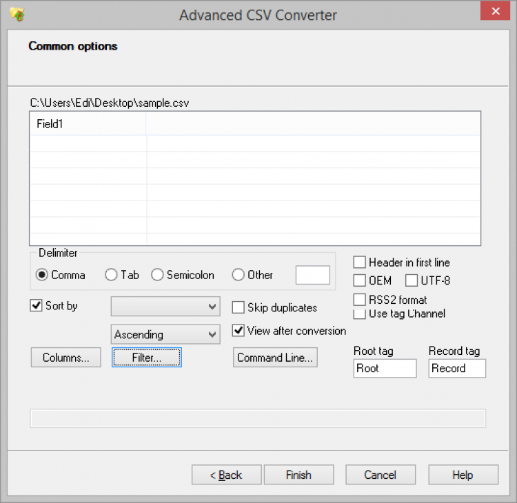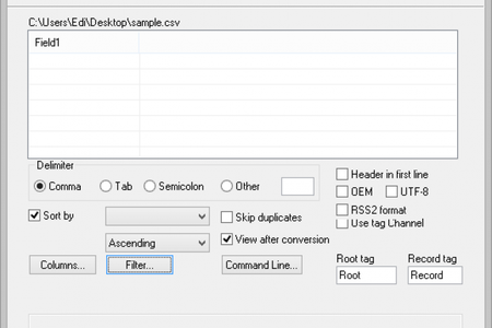 Advanced CSV Converter - это мощная утилита для конвертирования CSV файлов в форматы DBF, Excel(XLS и XLSX), TXT, HTML, PRG, XML, SQL и RTF. Advanced CSV Converter может конвертировать отдельные CSV файлы, или сразу несколько файлов в пакетном режиме. Она предоставляет ряд настроек, фильтры, а также может конвертировать CSV файлы через командную строку.