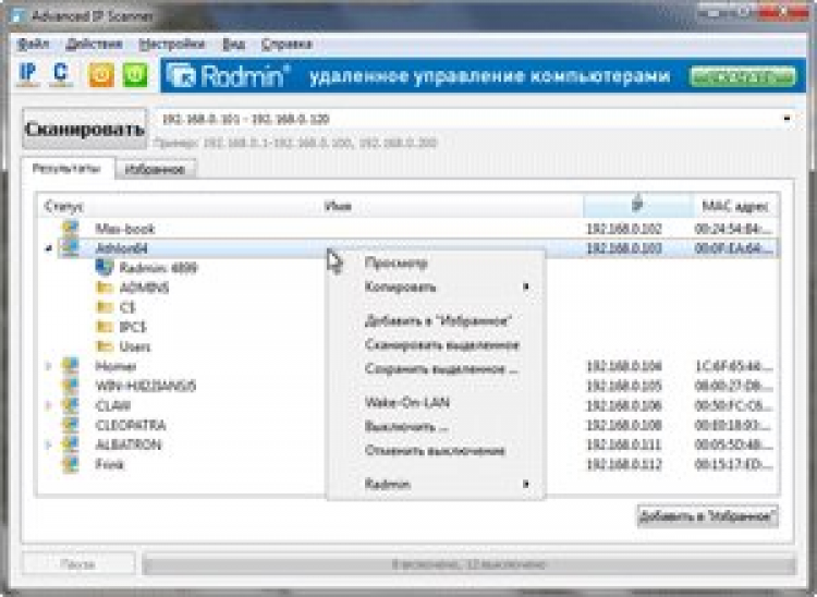 Функция Wake-On-LAN позволяет включать удаленный компьютер или группу компьютеров. Благодаря интеграции с программой удаленного доступа Radmin при сканировании сети Advanced IP Scanner находит все машины с запущенным Radmin Server и позволяет подключиться к ним в один клик. Для этого на компьютере, с которого осуществляется сканирование, должен быть установлен бесплатный Radmin Viewer. Подключение по Radmin возможно в различных режимах - управления, обмена файлами, Telnet и др. Использовать Advanced IP Scanner для сканирования сети легко благодаря дружественному интерфейсу. Для упрощения групповых операций можно добавлять машины для сканирования в Избранное и сканировать только выбранные компьютеры. Список сохраняется и при запуске программы и загружается автоматически.