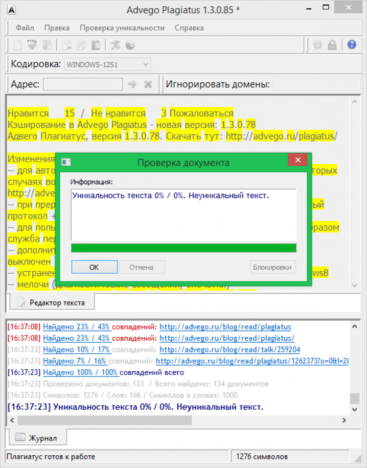 Advego Plagiatus ищет в сети ресурсы с похожим текстом, предоставляет прямые ссылки на эти ресурсы о оценивает (в процентах) степень совпадений текста. Кроме этого, программа поможет узнать степень уникальности указанной веб-страницы.