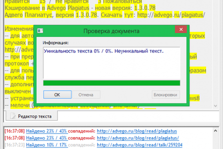 Advego Plagiatus Полезная программа для всех, кто занимается написанием статей или текстов для веб-сайтов. С ее помощью можно легко и быстро выяснить, насколько уникальным является данный фрагмент текста.