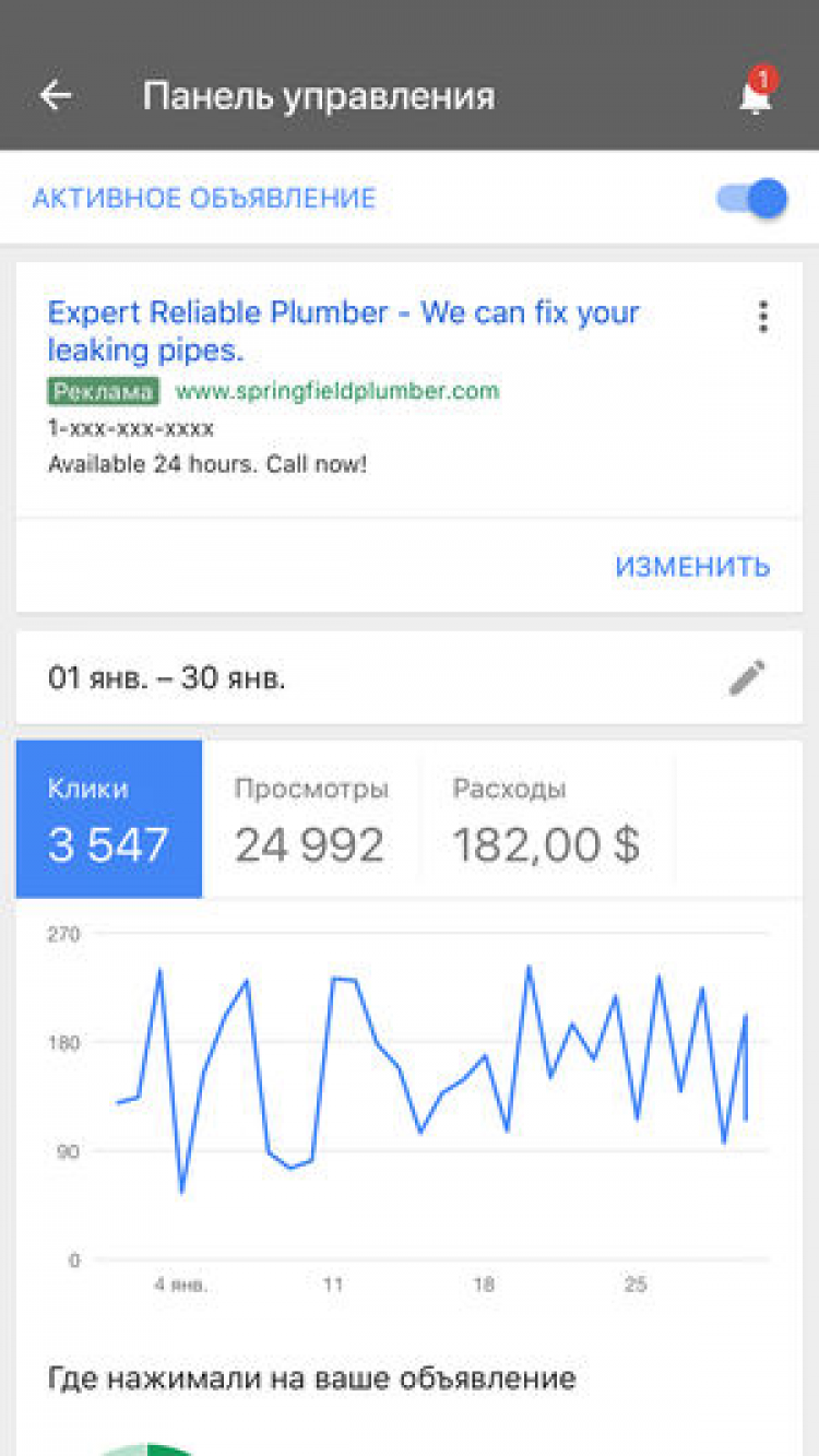 Приложение для AdWords Express, которое поможет вам привлечь новых клиентов, создавать объявления и осуществлять оплату только за переходы потенциальных клиентов по вашей рекламе. Так же, вы сможете оценивать эффективность своих объявлений, анализировать статистику по звонкам, кликам и просмотрам, вносить изменения в рекламный текст и размер бюджета, получать уведомления, а так же многое другое.