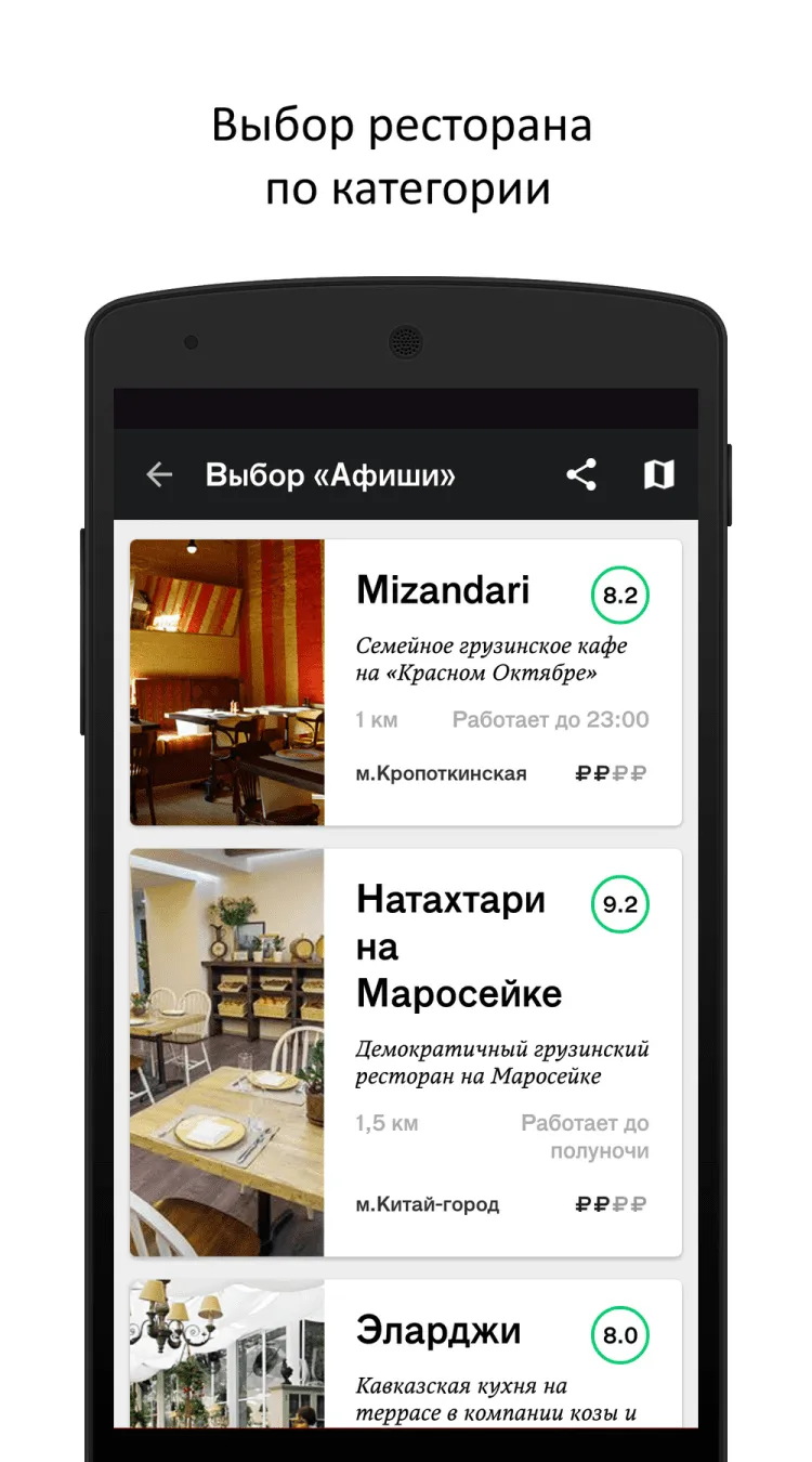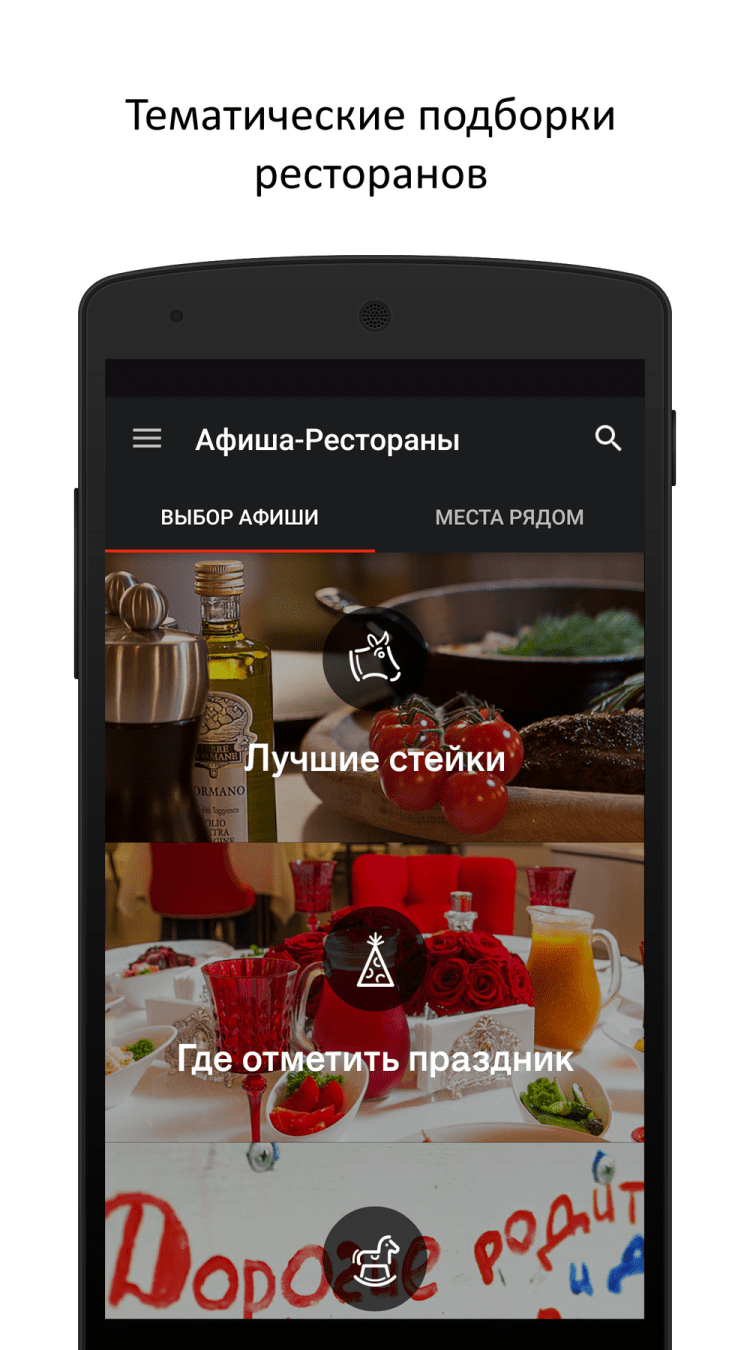 Афиша-Рестораны Это приложение поможет вам выбрать ресторан или бар в Москве, Санкт-Петербурге, Сочи, либо ряде других городов России. С помощью приложения Афиша-Рестораны, вы сможете получить информацию о тысячах заведений вашего города, прочитать рецензии других посетителей, либо написать свою. Облегчить выбор поможет постоянное обновление списков заведений по категориям.